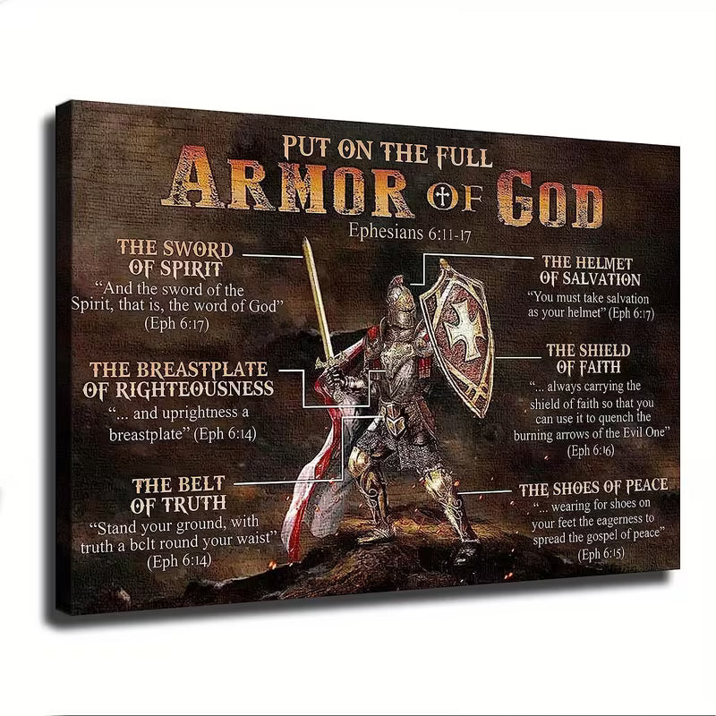 ā High-Quality Canvas Print: Features vivid, rich colors and a clear depiction of the knight and scripture for a striking visual impact.